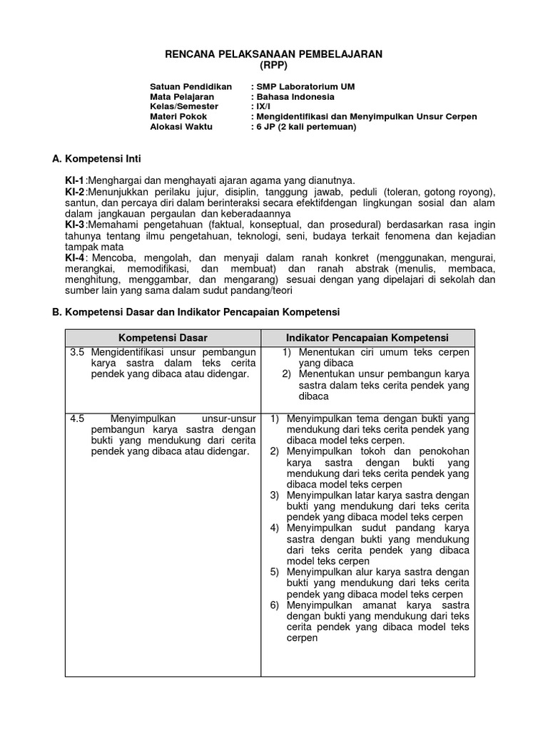 Disesuaikan dengan kurikulum darurat saat ini dengan tetap. RPP Bahasa Indonesia SMP Kelas 9 Lengkap ini sendiri terdiri dari Cover Konpetensi Inti dan Kompetensi Dasar Kriteria Ketuntasan Minimal KKM atau Kriteria Belajar Minimal. Peserta didik dapat mengidentifikasi unsur pembangun karya sastra dalam teks cerita pendek yang dibaca atau didengar.