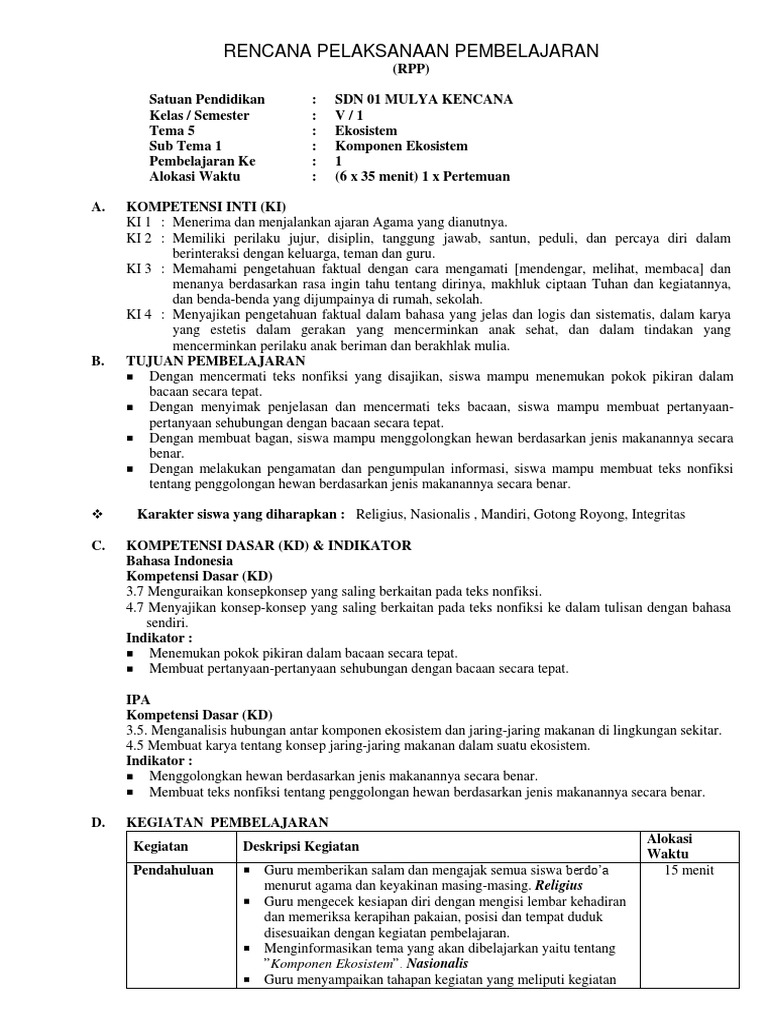 Rpp 5 komponen. Rpp k13 kelas 5 merupakan salah satu komponen perangkat pembelajaran yang memiliki. Guru dapat melihat keberhasilanpembelajaran tentang teks nonfiksi dari hasil keseluruhan kelas secaraumum. SUBTEMA 1 KOMPONEN EKOSISTEM.