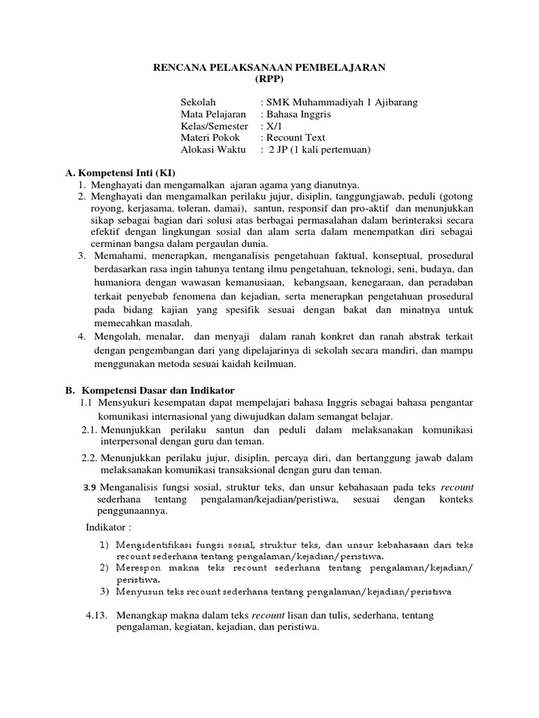 Bahasa Inggris KelasSemester. Recount text is a text that retells a story about past events or experiences in the order they happened. Ini adalah RPP 1 lembar yang dibuat sebagai salah satu tugas PPG Dalam Jabatan 2020 Angkatan 1 LPTK UHAMKA yang didesain secara simple dan mudah dipahami.