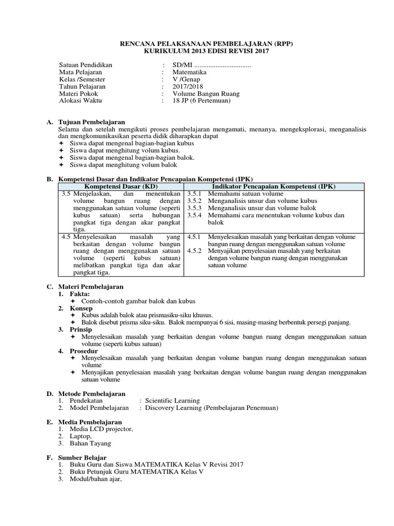 Rpp Volume Kubus Dan Balok Kelas 5 Sd